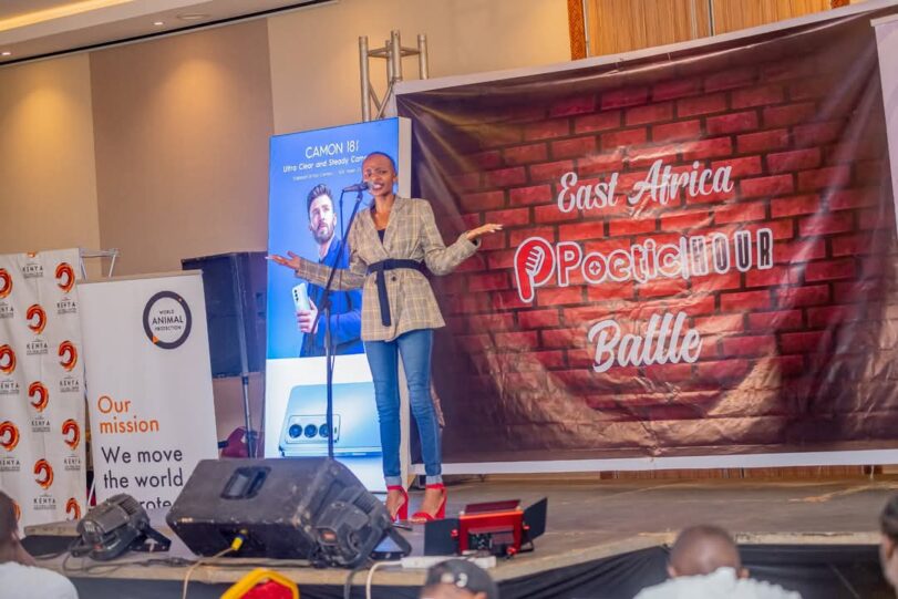 Felicity Mudis lors d’une édition précédente de l’East Africa Poetic Hour Battle. Photo utilisée avec permission.
