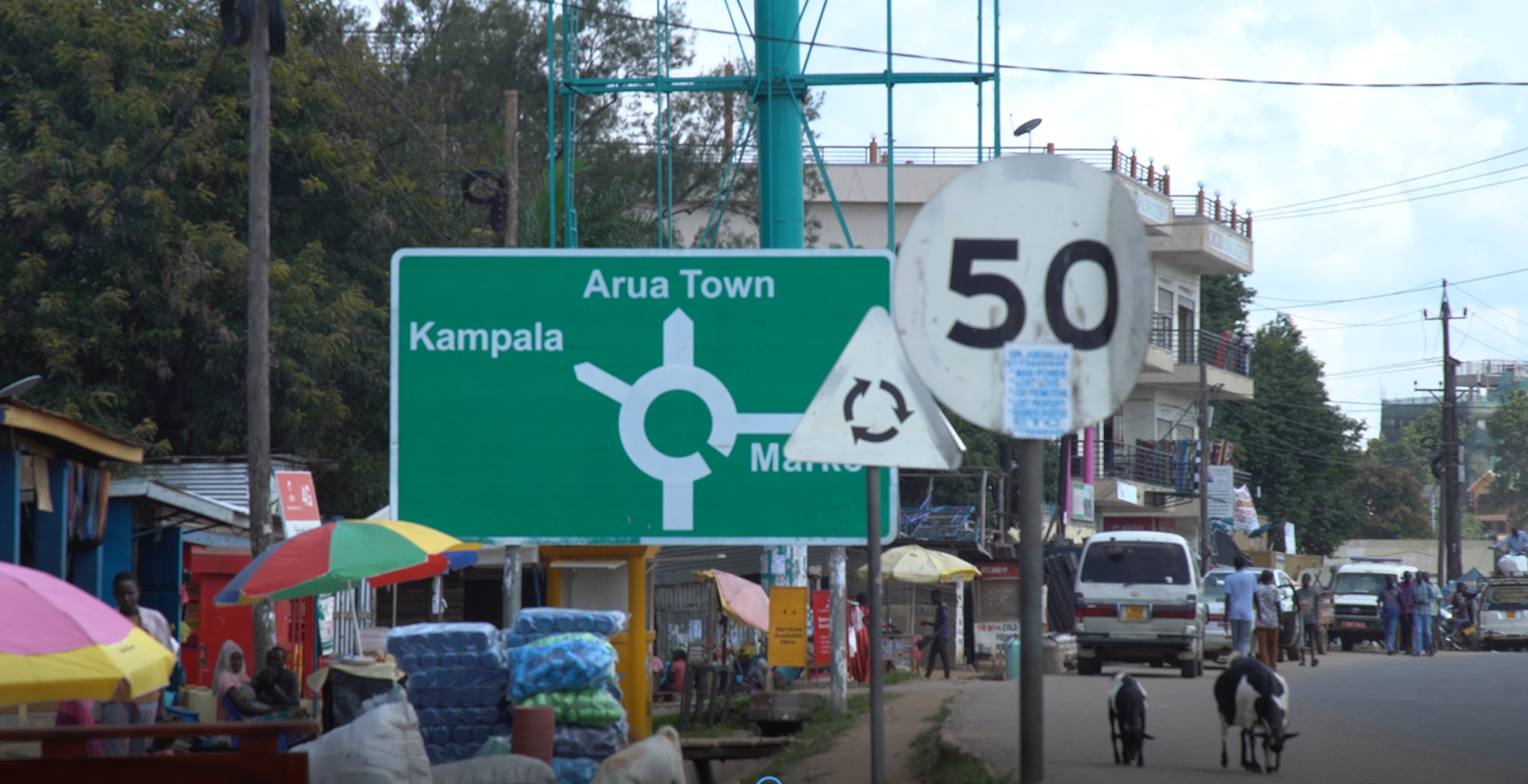A road sign displaying directions and distances to Arua Town and Kampala, accompanied by a speed limit sign of 50 km/h.