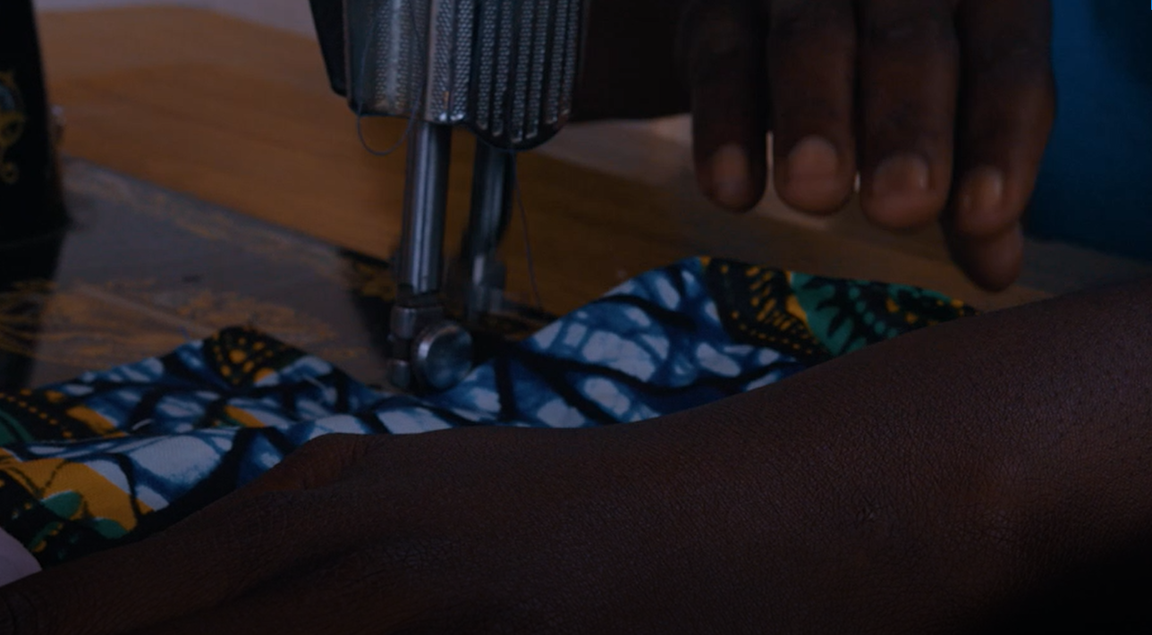 A sewing machine stitches the kitenge fabric and thread together, forming beautiful outfits from the vibrant material.