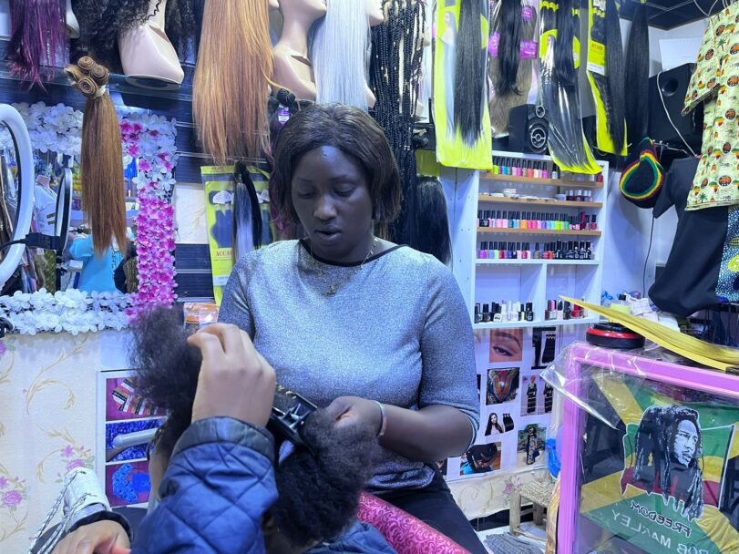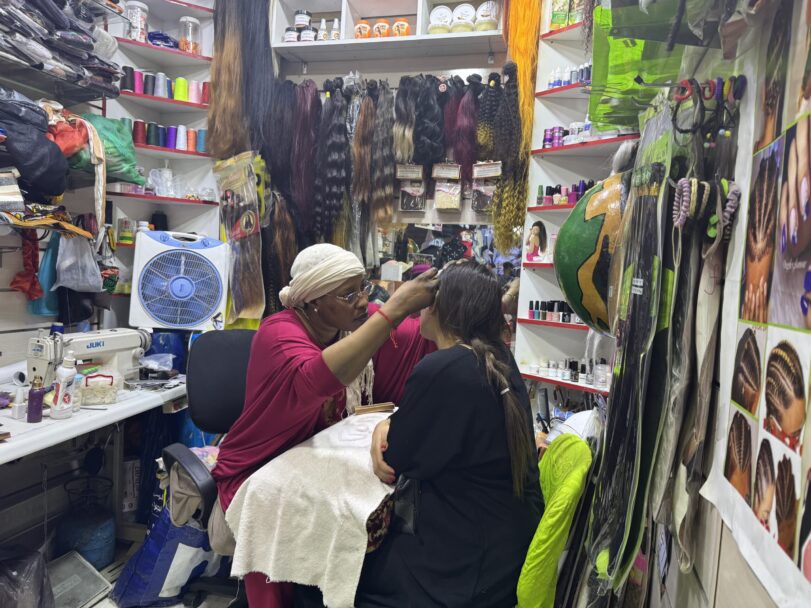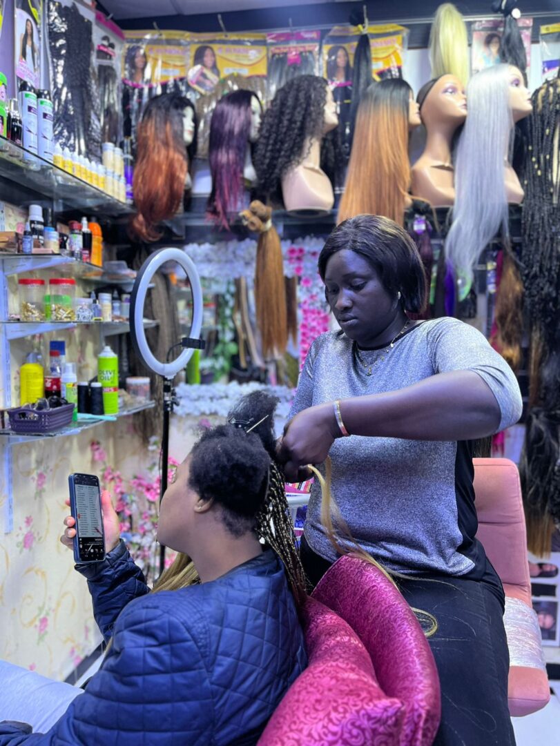 She explains further, “I get my products from Senegal. There are people who come with their cars, bringing accessories, wigs, shea butter, and all the items I sell here. I buy from them and sell it in my shop,” she continues, all while carefully applying eyelashes to her client, who listens intently.