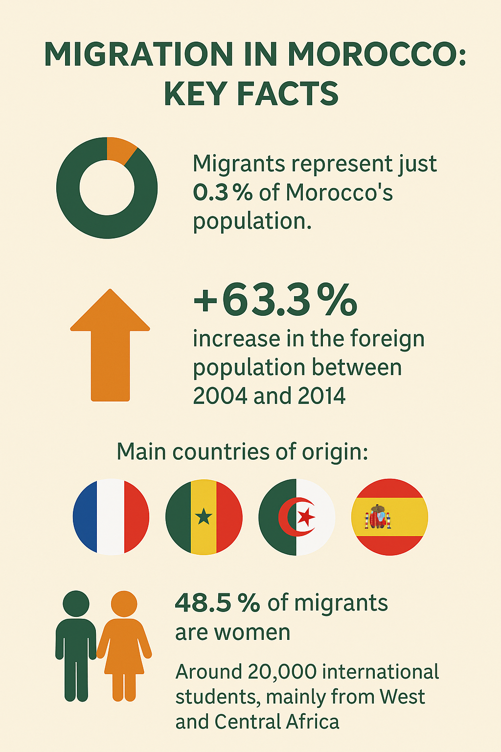 Women represent 48.5% of Morocco’s migrant population, according to the High Commission for Planning (HCP, 2019). Most immigrants come from countries with strong historical or economic ties to Morocco, including France, Senegal, Algeria, and Spain. In recent years, the country’s relative economic growth has attracted a more diverse migrant workforce, particularly from China, the Philippines, and, to a lesser extent, Turkey.