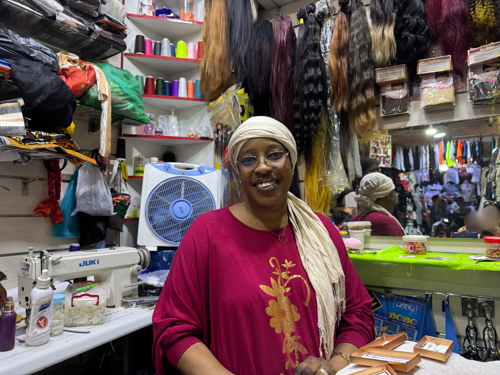 She continued working while answering some of my questions. The small shop was fascinating—filled with accessories, hair wigs, beauty products, and just about everything a woman might need.